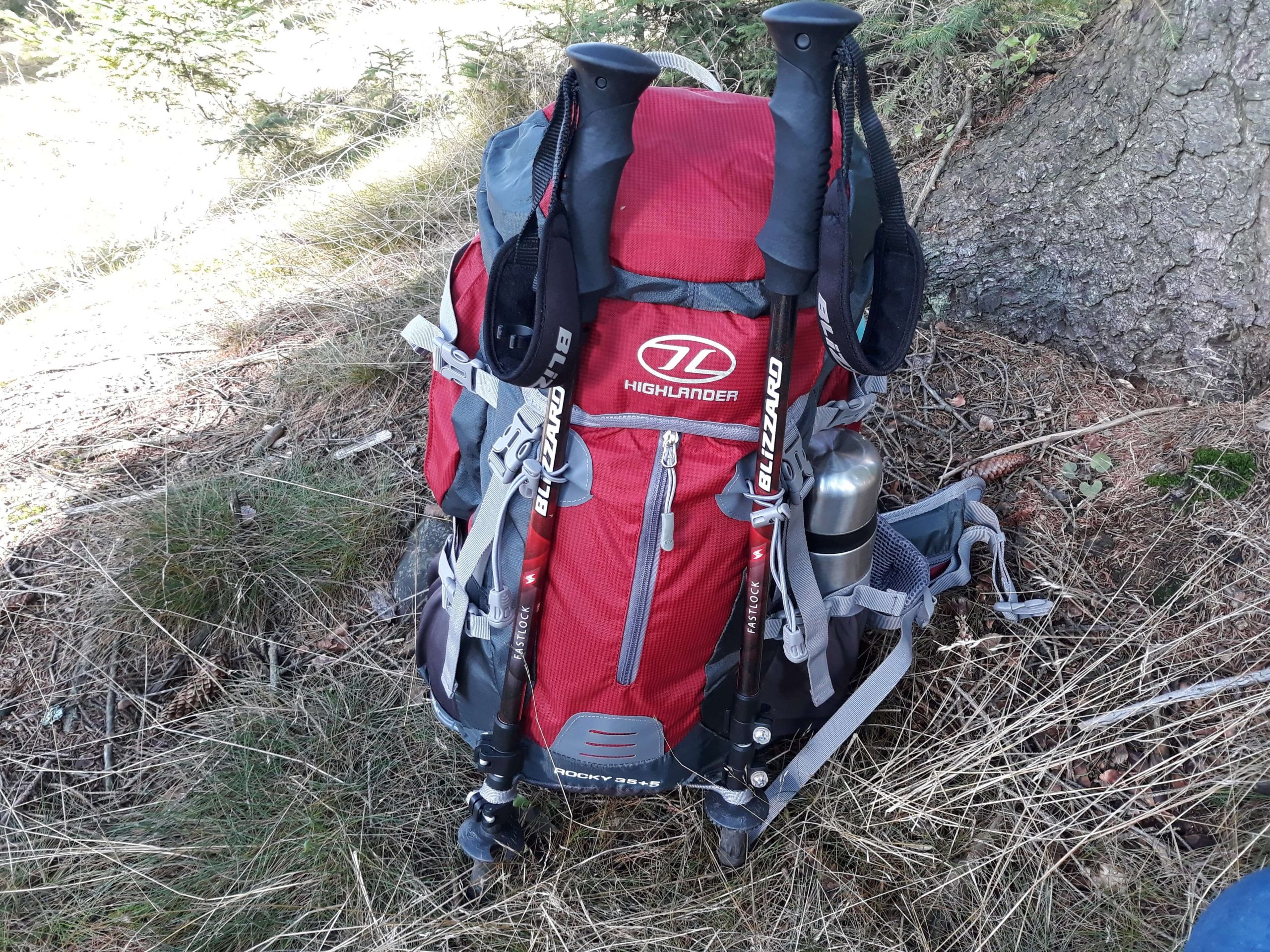 Plně naložený batoh s hůlkami - Highlander Rocky 35+5 l