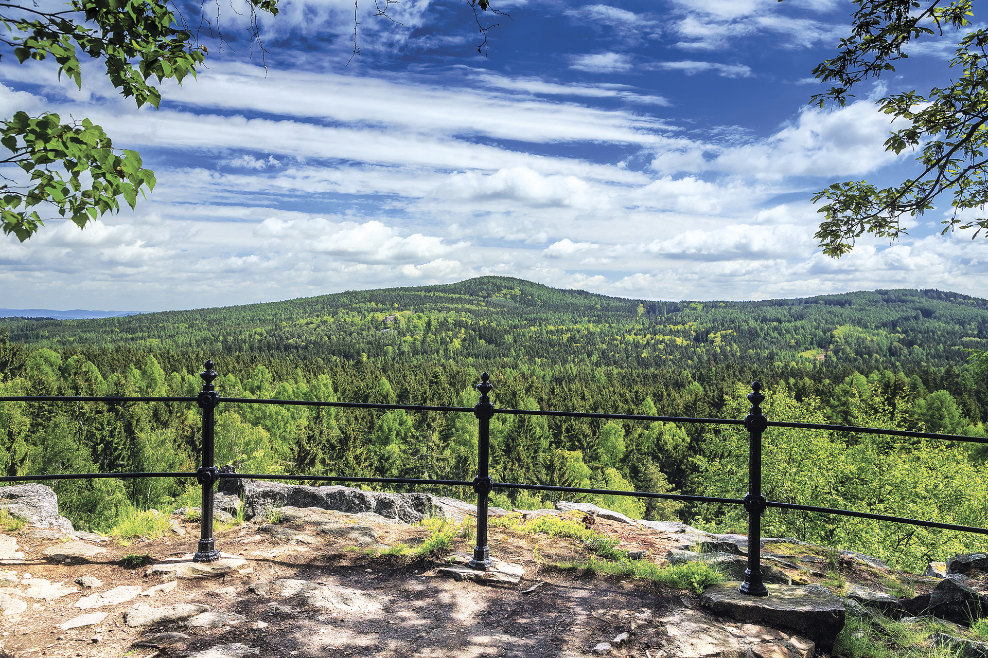Z vyhlídky na Jindřichově skále se otevírají široké výhledy na okolní vrchovinu
