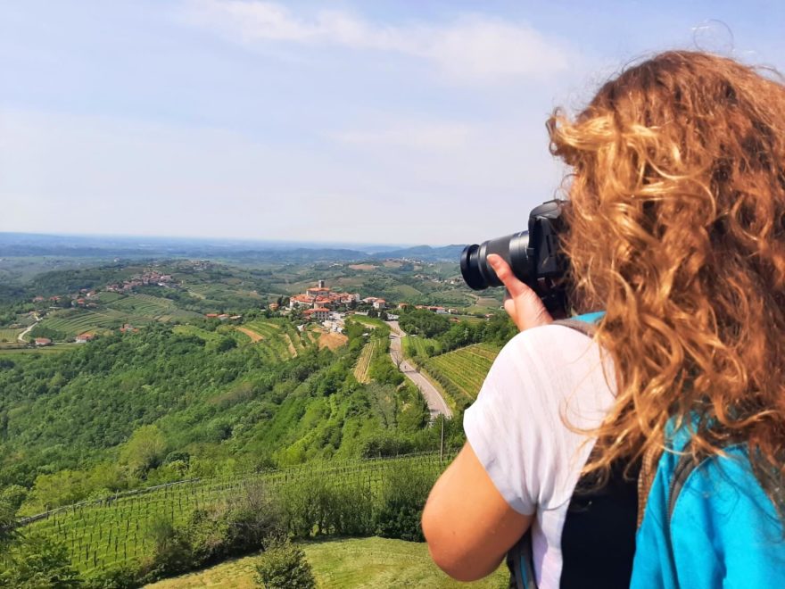 Rozhledna a památník války na vrcholku Gonjače, vinařská oblast Goriška Brda, Slovinsko.