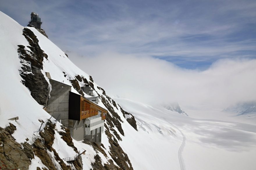Výhledy z okna, vytesaného ve skále v severní stěně Eigeru, Švýcarsko.