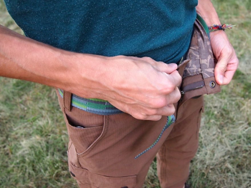 Pánské kalhoty Warmpeace Galt. Pravá kapsa má ještě tajnou vnitřní kapsu na zip.