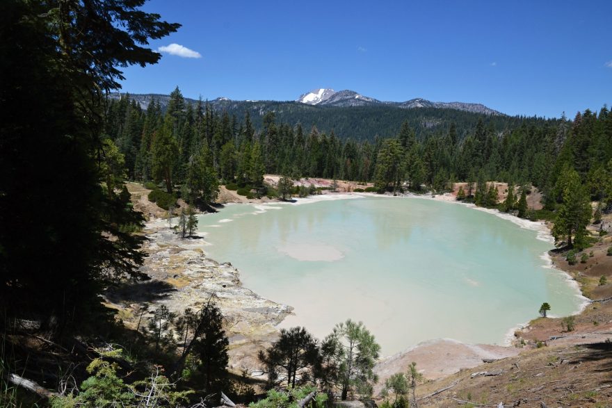 Při výstupu na Lassen Peak (3187 m) se otvírají výhledy na jezero Lake Helen a okolní vrcholky, které byly dříve součástí obřího stratovulkánu, Lassen Volcani NP, USA