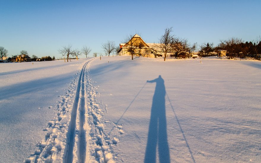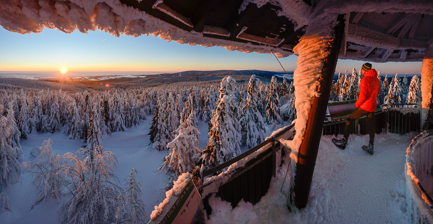 Mrazivý výhled z rozhledny na Anenském vrchu, Orlické hory.