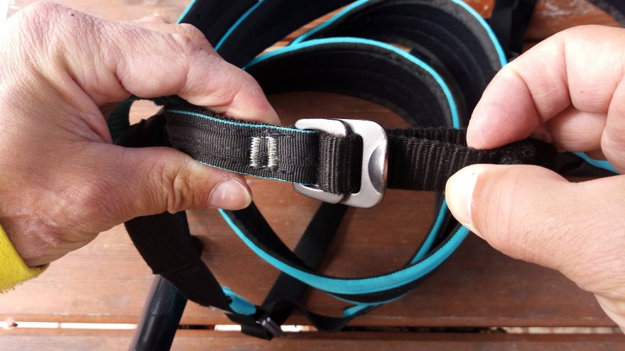 Kontrola elastických popruhů a jejich spojení s karabinami a tlumičem pádu