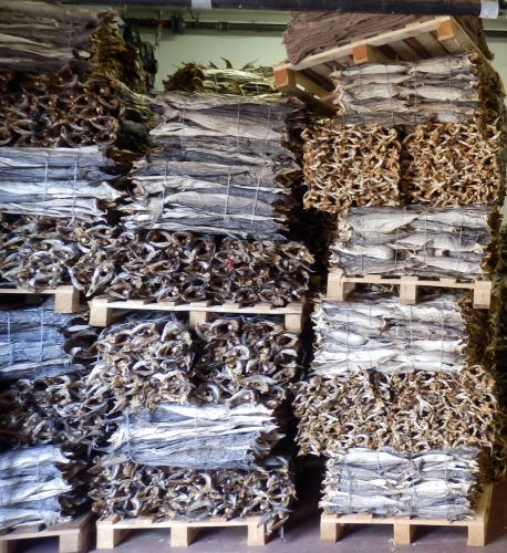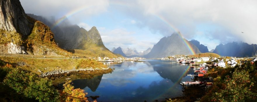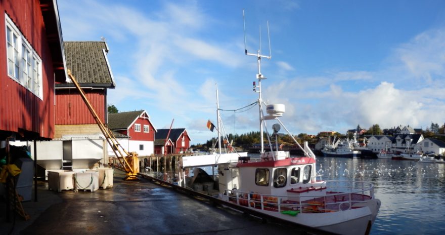 červené domky rorbu, což jsou sezónní rybářské chaty, postavené na dřevěných pilotech.