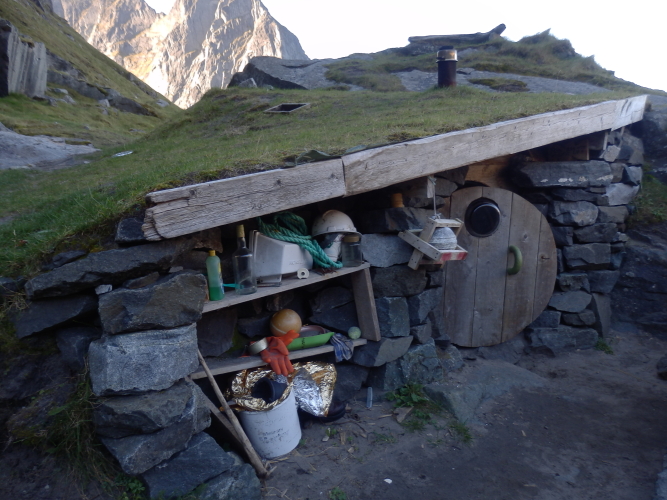 Opuštěná pláž Kvalvika ukrývá velrybí kosti nebo poustevnickou chatu. Lofoty, Norsko.
