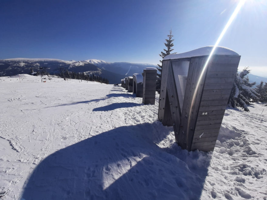 Nápis Medvědín na vrcholku stejnojmenné lanovky ve Špindlerově Mlýně je prolézačkou pro děti v létě i zimě.