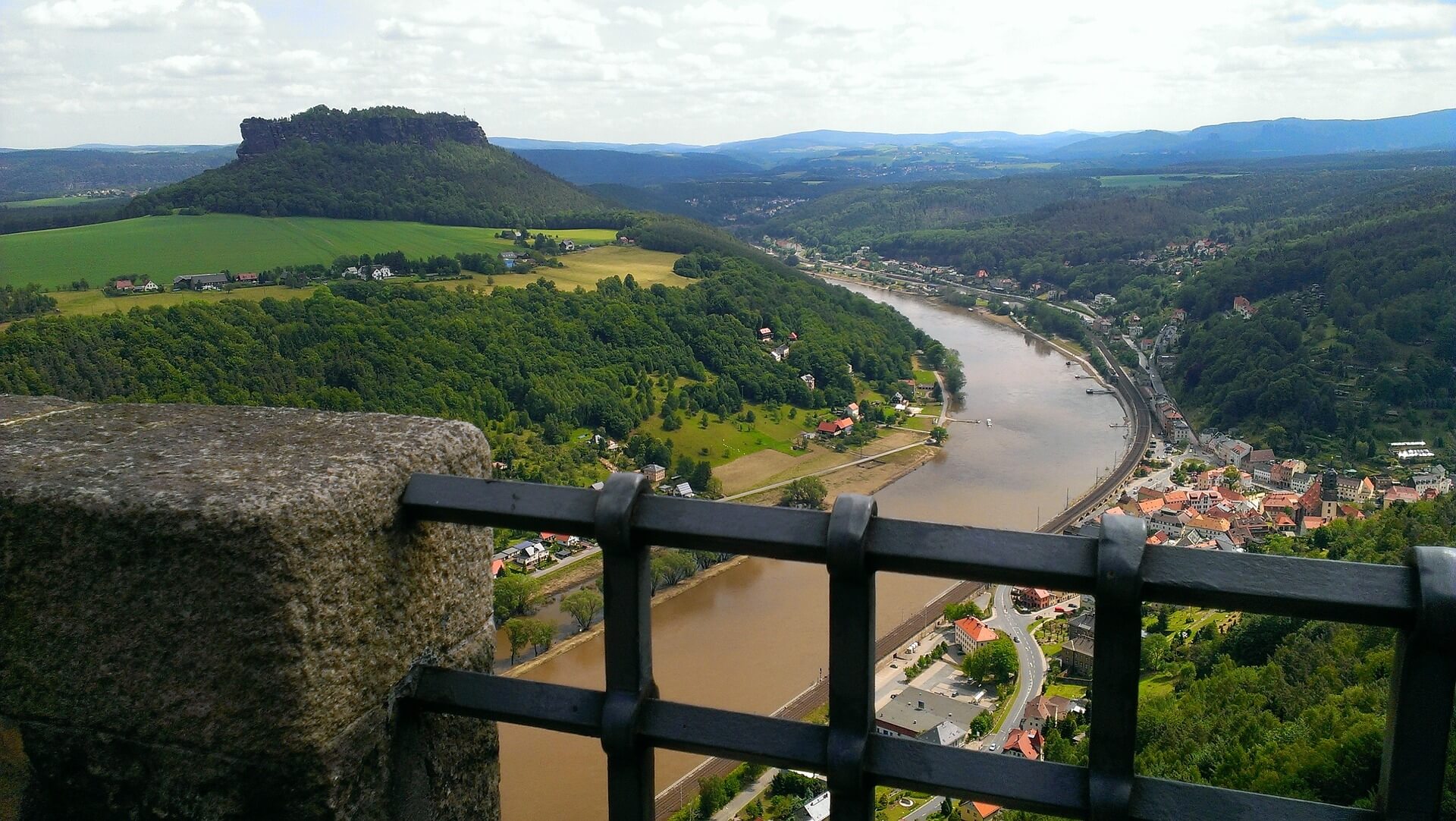 Pohled na stolovou horu Lilienstein přes řeku Labe z pevnosti Konigstein. Saské Švýcarsko.