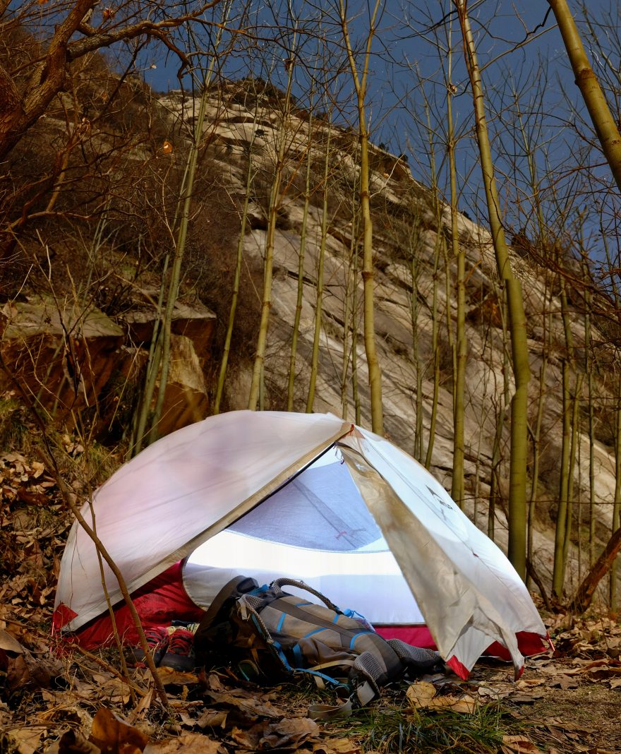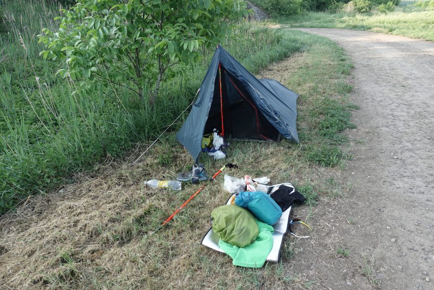 Použití hůlek jako nosné konstrukce odlehčí batohu od stanových tyček.