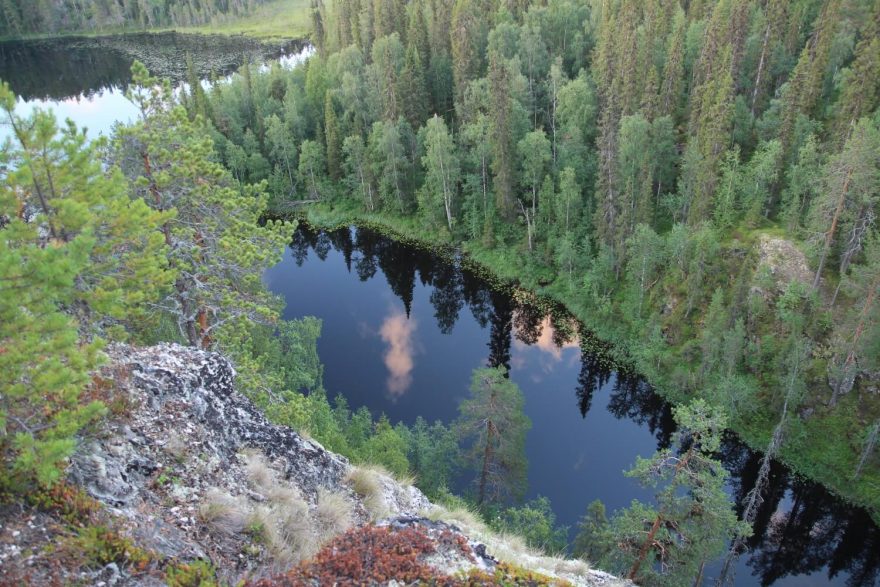 Stezka Karhunkierros vede podél řeky Oulankajoki a kopíruje její meandrovité zákruty, křižuje ji pomocí visacích mostů, poskytuje vyhlídky na její vodopády a čas od času ji opustí, aby se mohla vyšplhat vzhůru a ukázat nám tak říční tok z ptačí perspektivy. Oulanka, Finsko