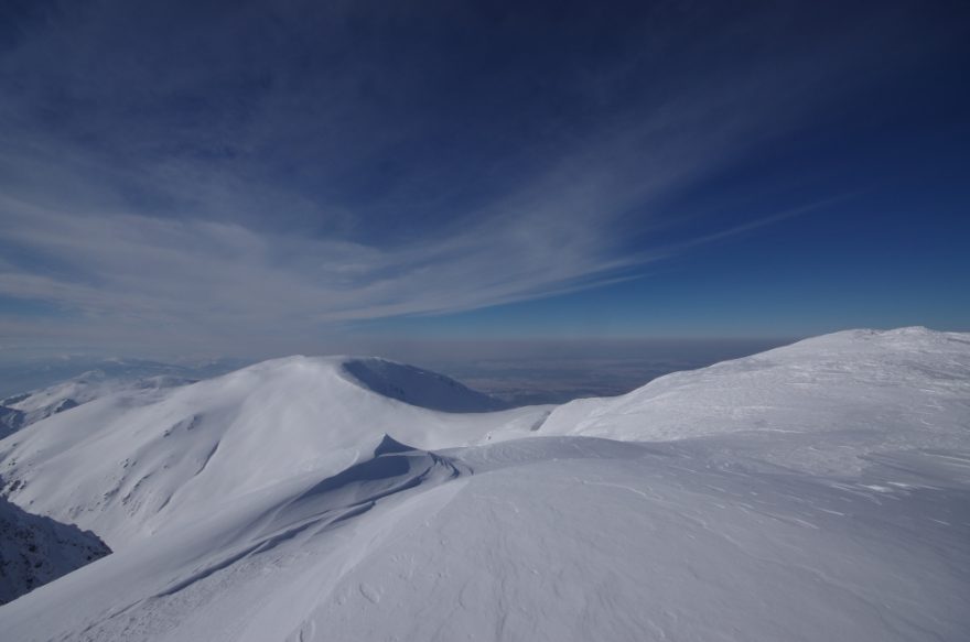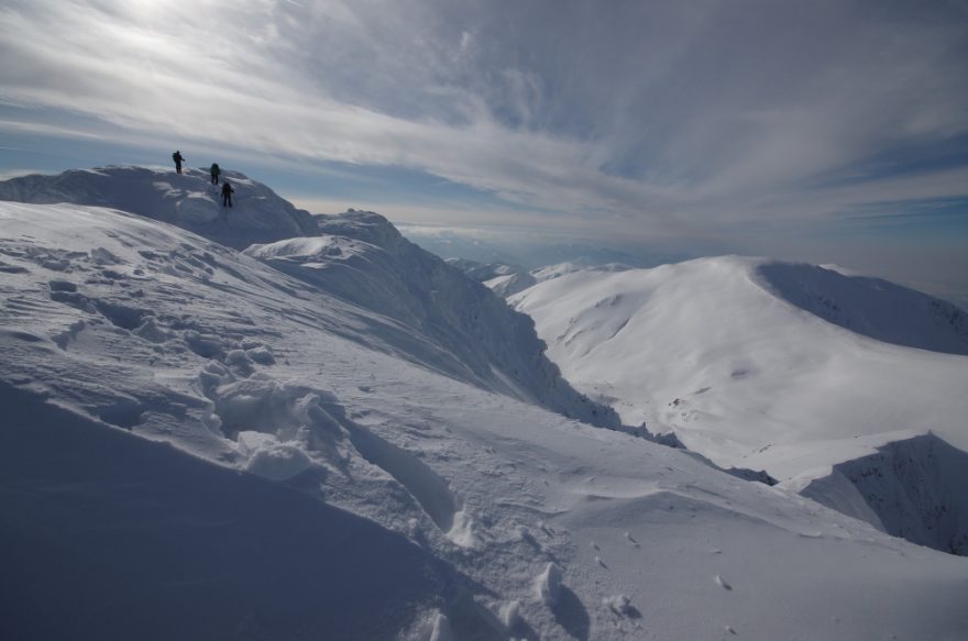 Vezměte si sněžnice, cepín a mačky – terén není vhodný ani pro skialpy, ani pro hrdinství jen v pohorkách.
