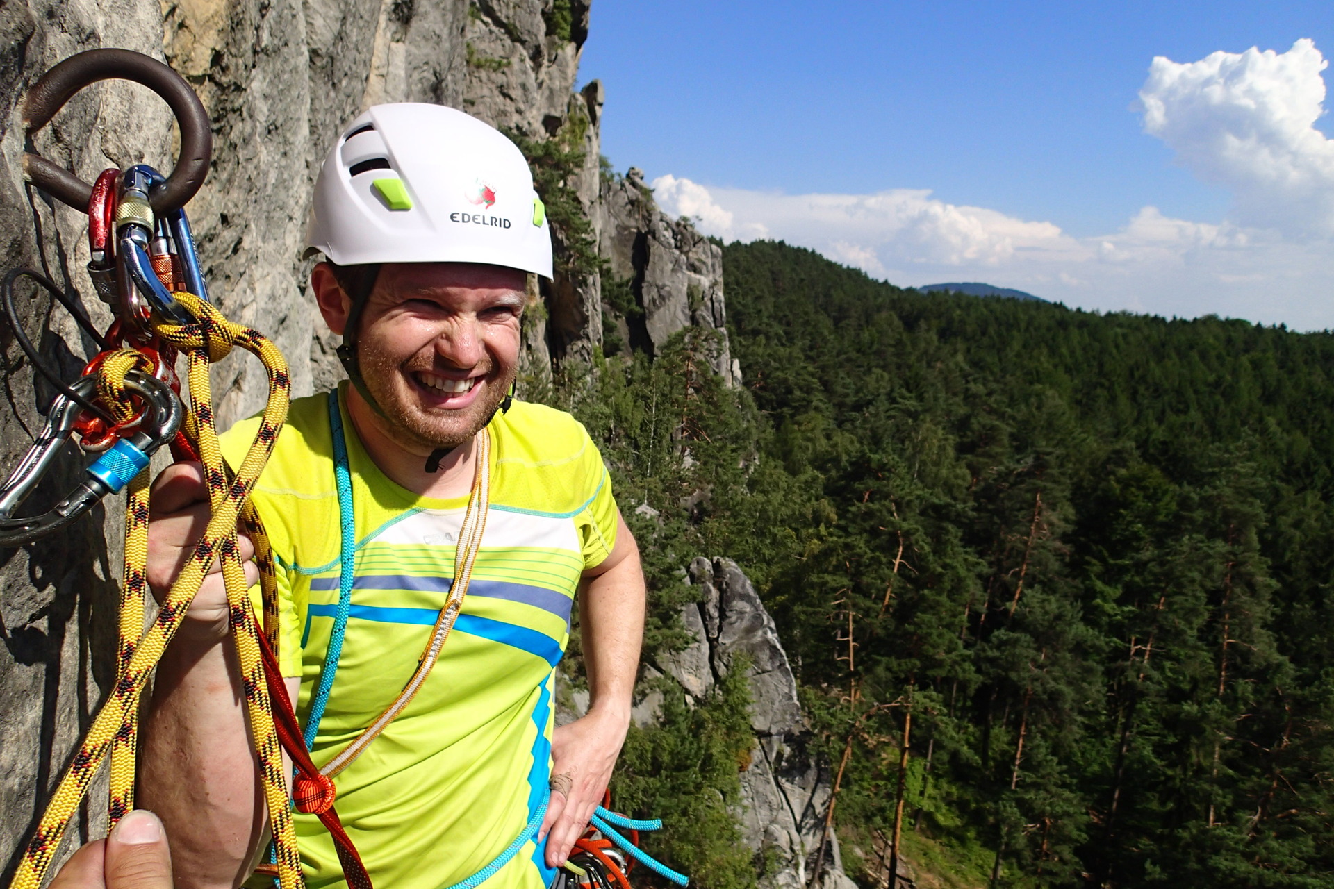 Helma, lano, karabiny, smyčky jsou základná vybavení pro lezení na skalách.