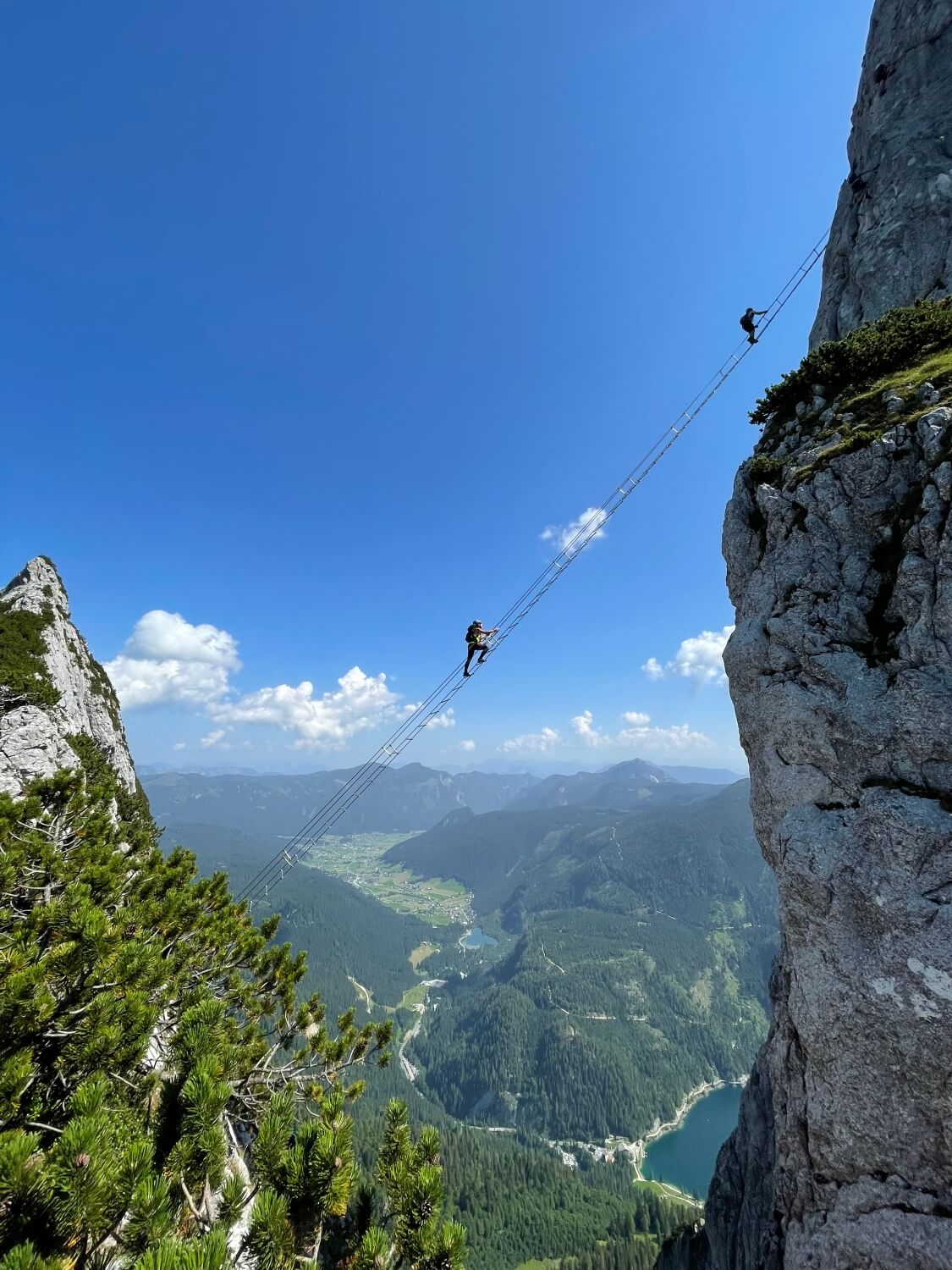 Vzdušný 40 metrů dlouhý žebřík Riesenleiter - Via ferrata Intersport Donnerkogel Klettersteig, Solná komora, Salzkammergut, rakouské Alpy. Foto Jana Souralová