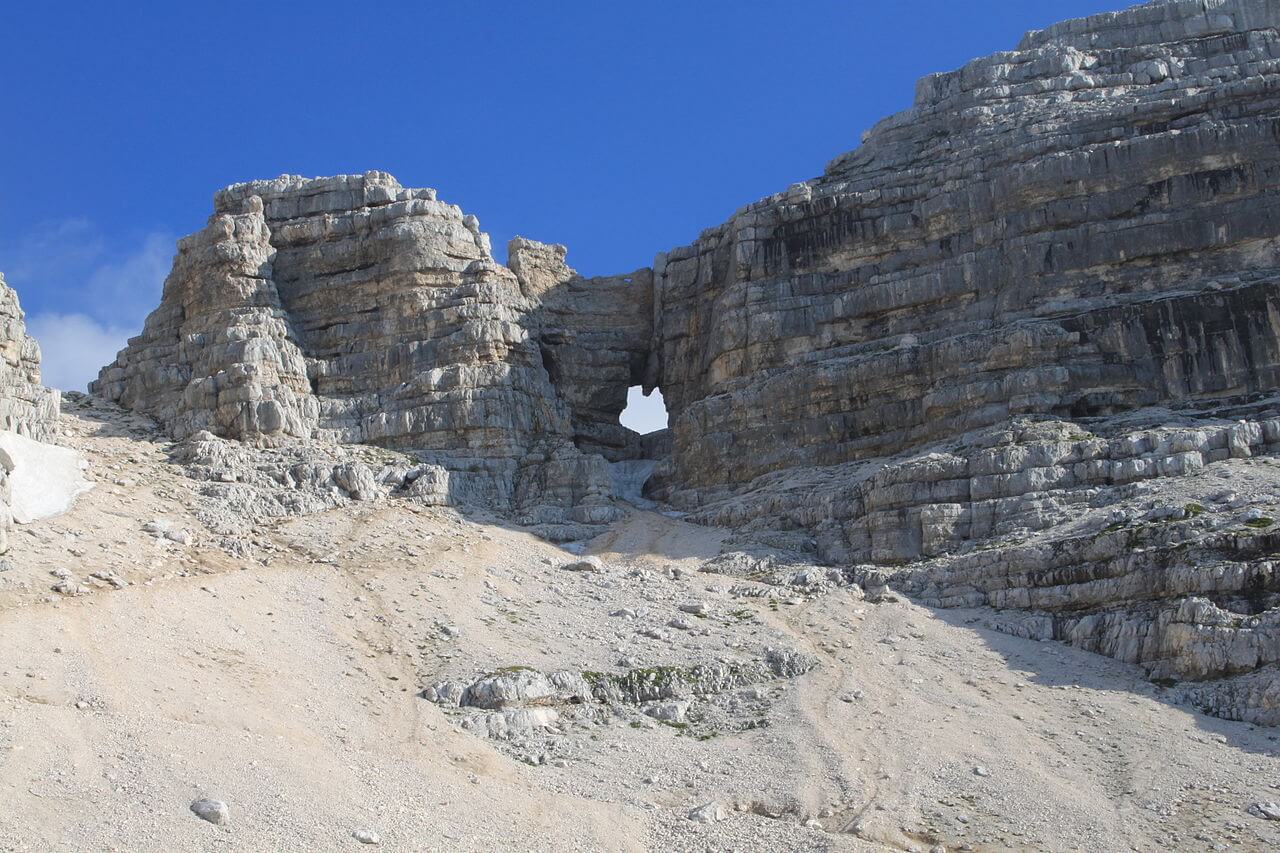 Rodinná ferata na Kaninu vede skrz kalní okno Prestreljenik, Julské Alpy