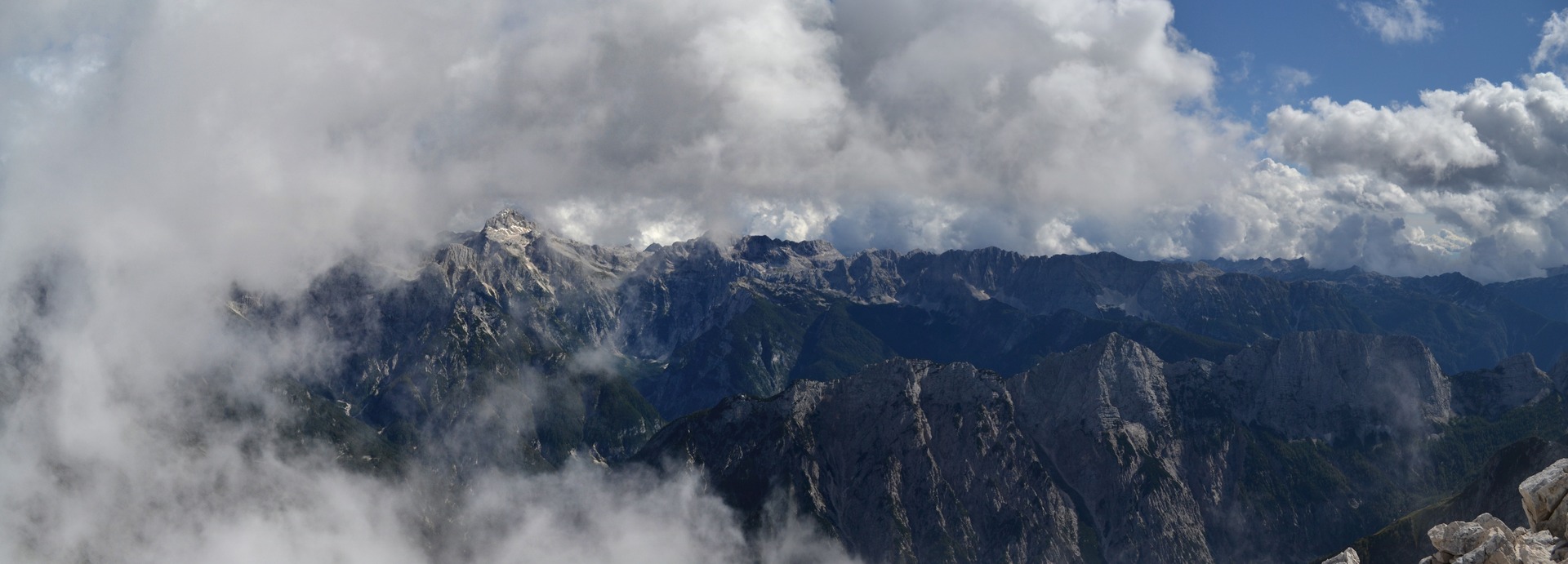 Výhled z Jalovce směrem k Triglavu, Julské Alpy, Slovinsko.
