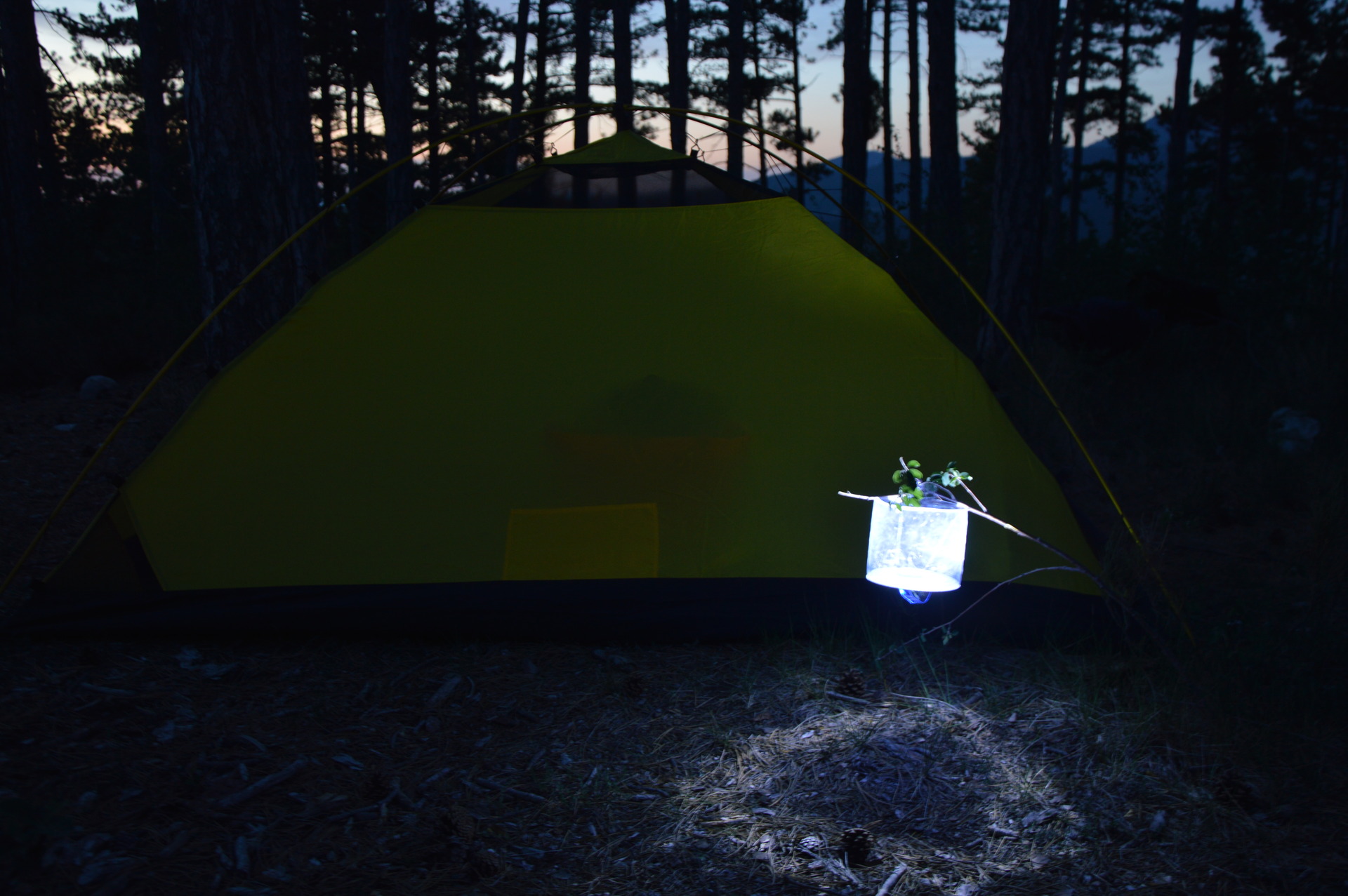 Osvětlení stanu lampou Luna při noční výstavbě.