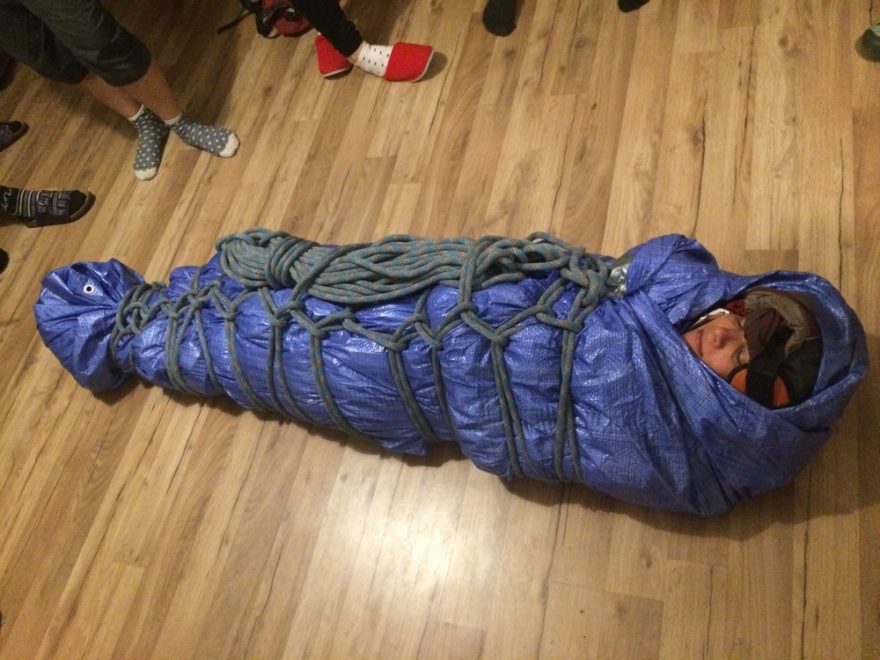 Detail tzv. šmodrchu, který kombinuje hypotermický balíček a provizorní nosítka.