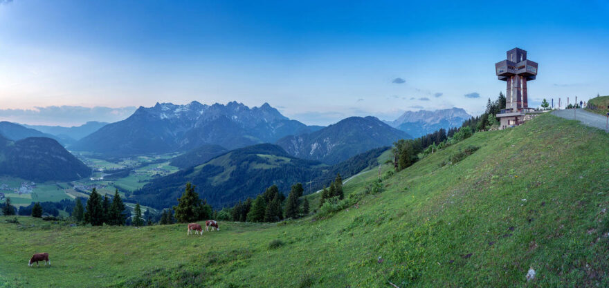 Cesty kolem Pilersee, Kostel v St. Ulrich a Jakobskreuz v pozadí