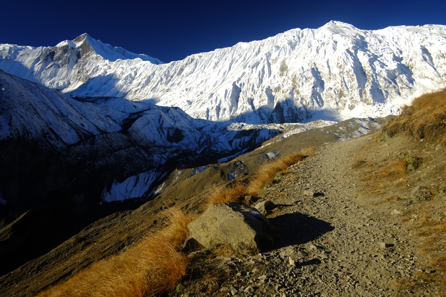 Cesta k Tilicho Lake pod hřebenem Annpurny. Annapurna circuit, Nepál.