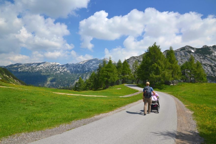 Na zvlněných travnatých pláních jsou roztroušené horské chaty a chalupy, pasou se tu krávy a kochat se dá nádhernými výhledy. Okruh kolem 6 jezer u Tauplitzalm, Totes gebirge, rakouské Alpy