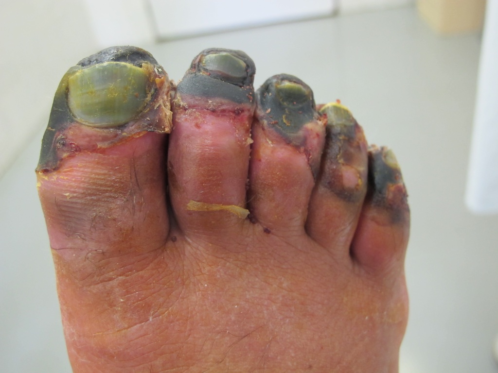 Chirurgická amputace odumřelé tkáně je doporučena mezi 6. a 9. týdnem od omrznutí, ač její rozsah lze celkem přesně předpovědět zobrazovacím vyšetřením zvaným scintigrafie již 3. den. (Obr. 4)