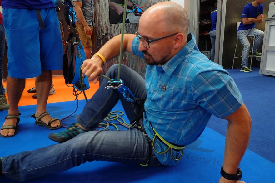 CAMP Tester Vojtěch Dvořák debatuje se zástupcem distributora s Karlem Mandíkem o jistítku MATIK a rychlému dávání lana pomocí pistol grifu.