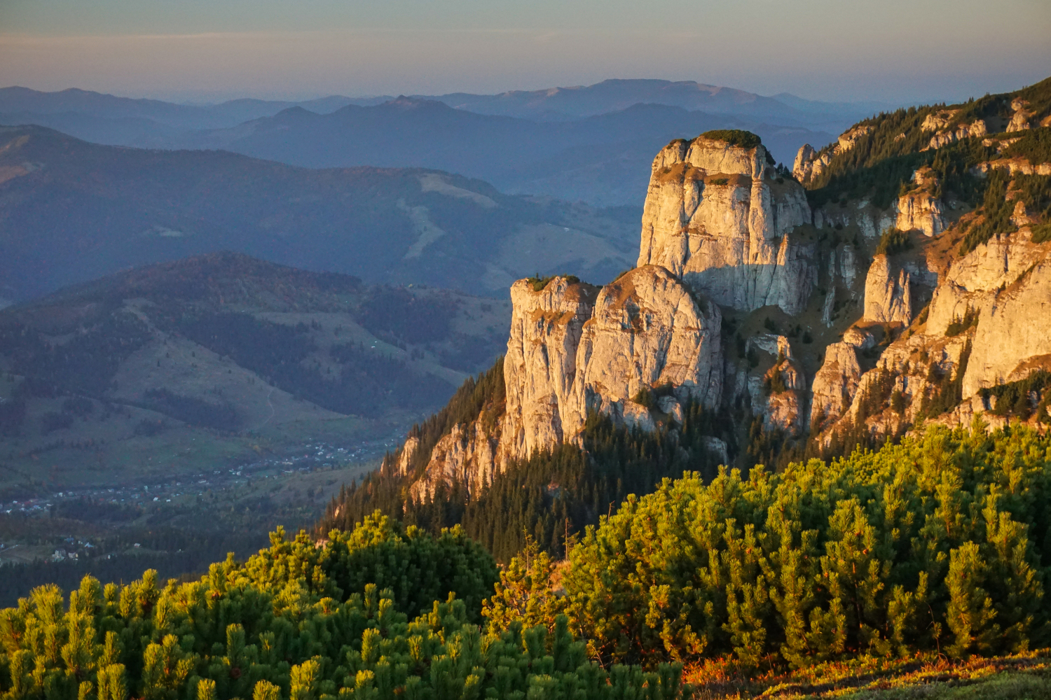 Výhledy z hřebene Ceahlau. Vápencové skály jsou typickým obrazem tohoto NP.