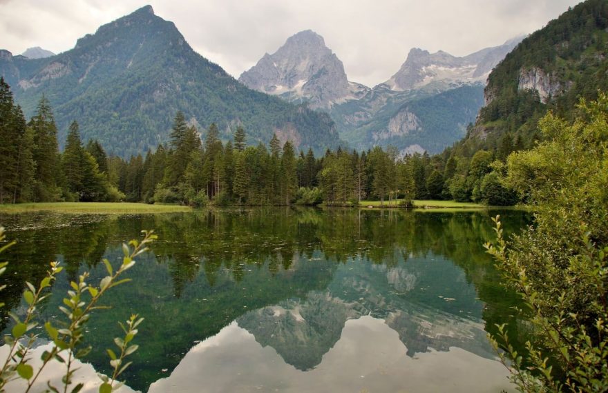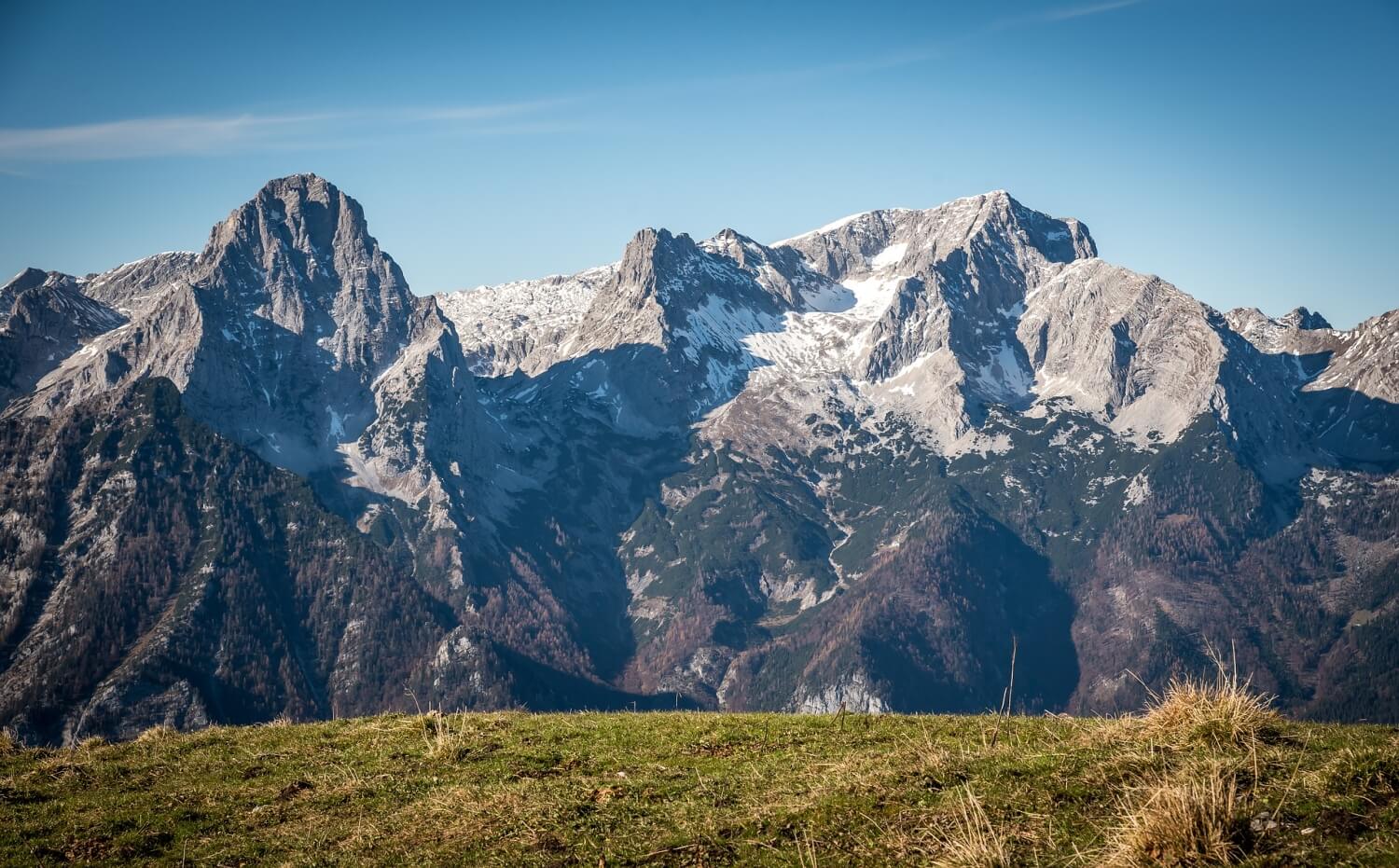 Vrcholky Grosser Priel a Spitzmauer z vrcholu Schafkögel, Totes Gebirge, Rakousko.