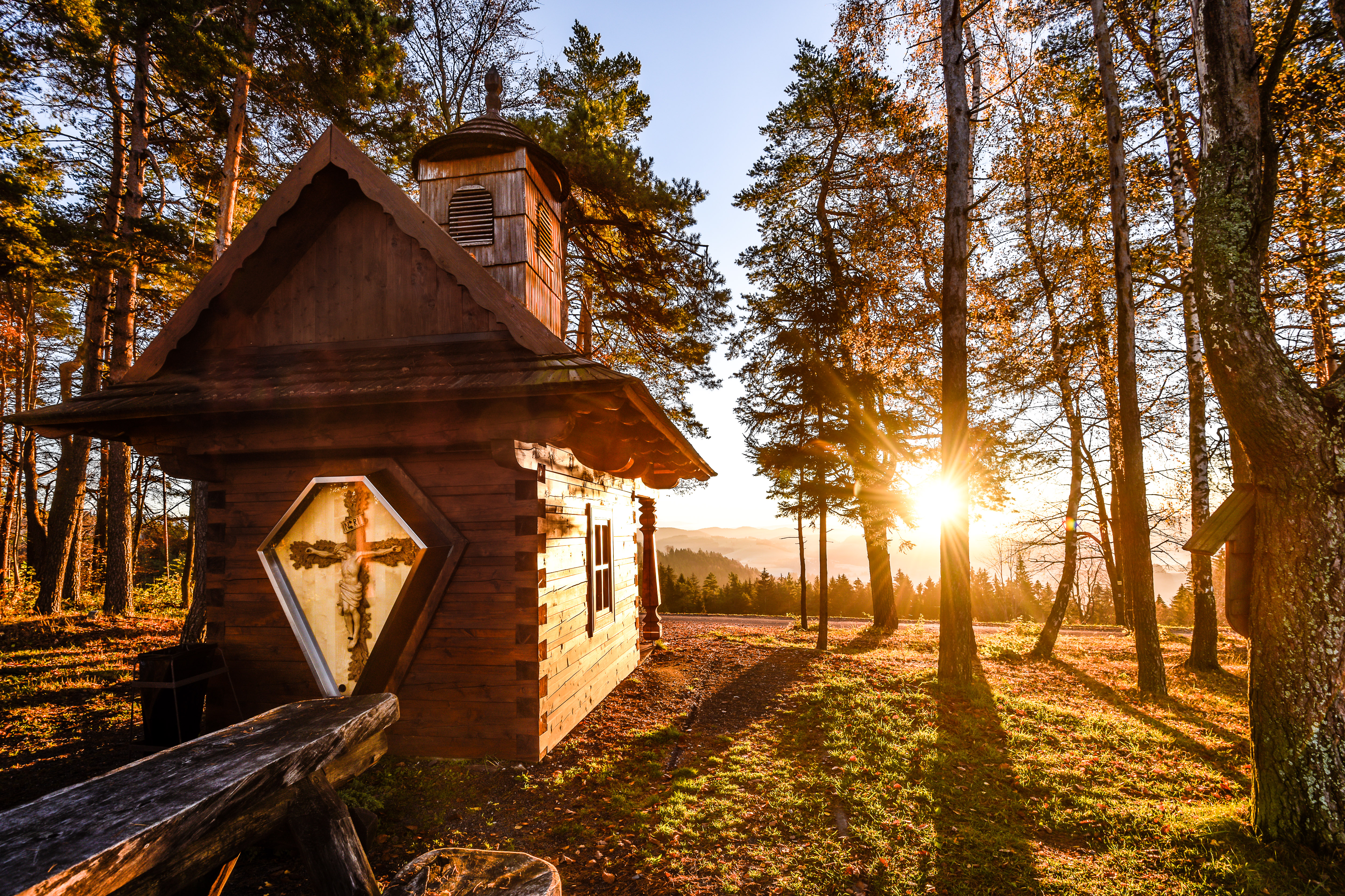 Javorníky leží tak trochu ve stínu svých známějších sousedů – na severu to jsou Moravskoslezské Beskydy a na jihu Bílé Karpaty. Přitom nejvyšší hora Javorníků, Veľký Javorník, je nejvyšším vrcholem přirozeného česko-slovenského hraničního hřebene a převyšuje Velkou Javořinu v Bílých Karpatech a o několik metrů i Velký Polom v Moravskoslezských Beskydech. Hřebenovou cestu Javorníků lemují četné kapličky, křížky nebo křížové cesty. Na fotografii je dřevěná kaple svatého Huberta stojící od roku 2012 nedaleko Valašské Senice.