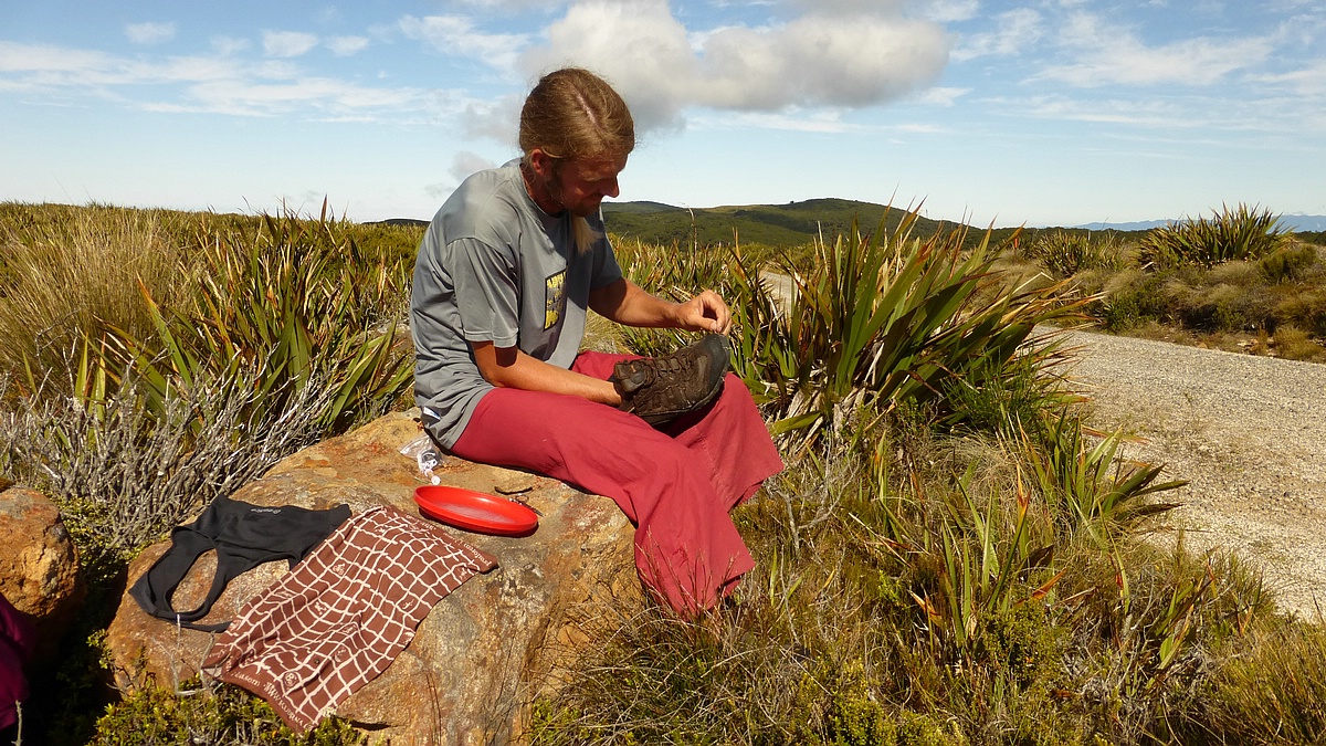 Zašívání bot je ke konci pochodu napříč Novým Zélandem na denním pořádku
