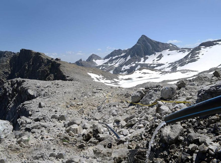 Výhled z vrcholu Schesaplana do údolí Brandnertal, pohoří Rätikon, Alpy.