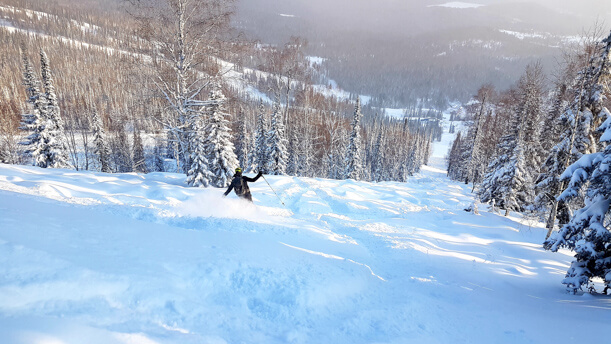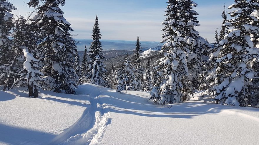 Takto vypadá les před tím, než nasněží. Skialp a freeride v Sheregeshi, Sibiř, Rusko.