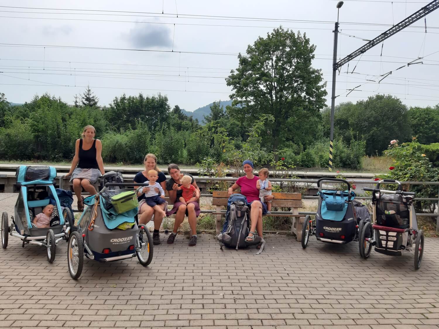 Nádraží v KLášterci n. Ohří - závěr výpravy. 4 holky, roční dítka, velké batohy, plně naložené vozíky a 5 dní na vandru po západní části Krušných hor.