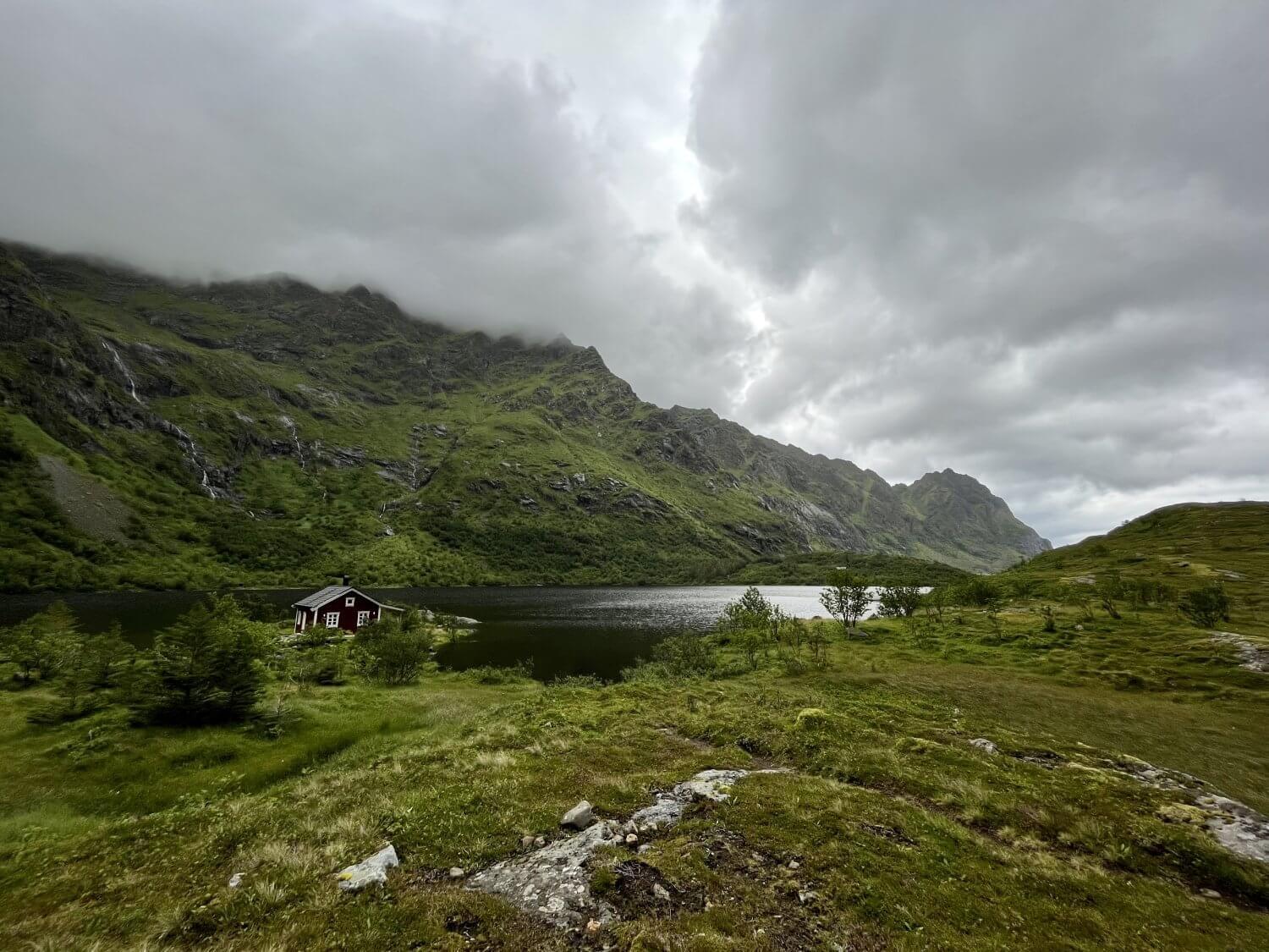 První den pochodu kolem jezera Agvatnet nad vesnicí A, Lofoty, Norsko.
