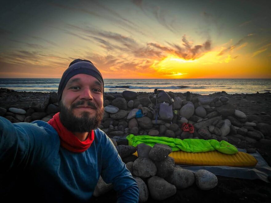 Další noc v ohrádce z kamení se západem slunce na obzoru na Gran Canarii