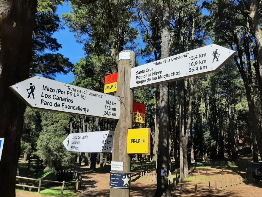 Rozcestník u Refugia del Pilar. GR 131 El Bastón, La Palma, Kanárské ostrovy