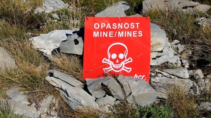 Po cestě potkáváme varovné tabule „Pozor miny“, pohoří Dinara, Chorvatsko