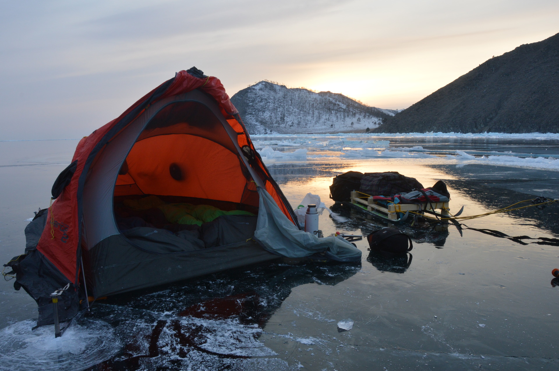 Stan Hannah Charge nám byl spolehlivým příbytkem, vpravo naše amatérsky vyrobené saně