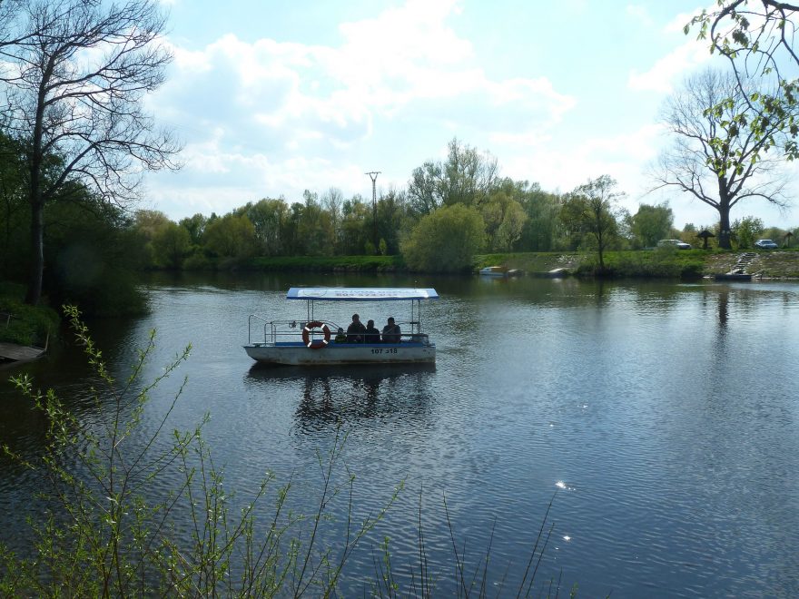 Přívoz Oseček na levém břehu Labe, v pozadí stánek s občerstvením a veřejné kotviště
