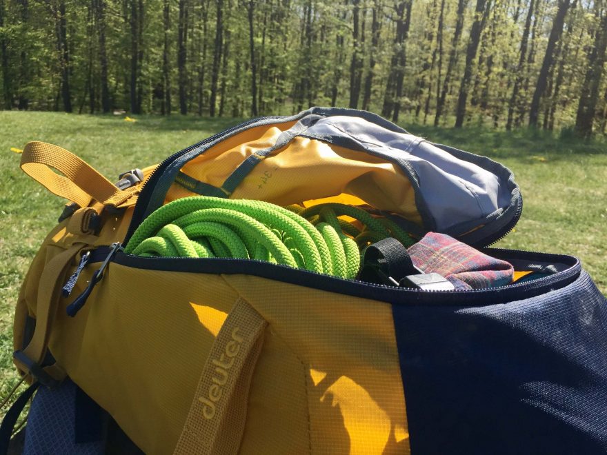 Ani při odklopeném víku batohu Deuter Guide 34+ lanu nespadne