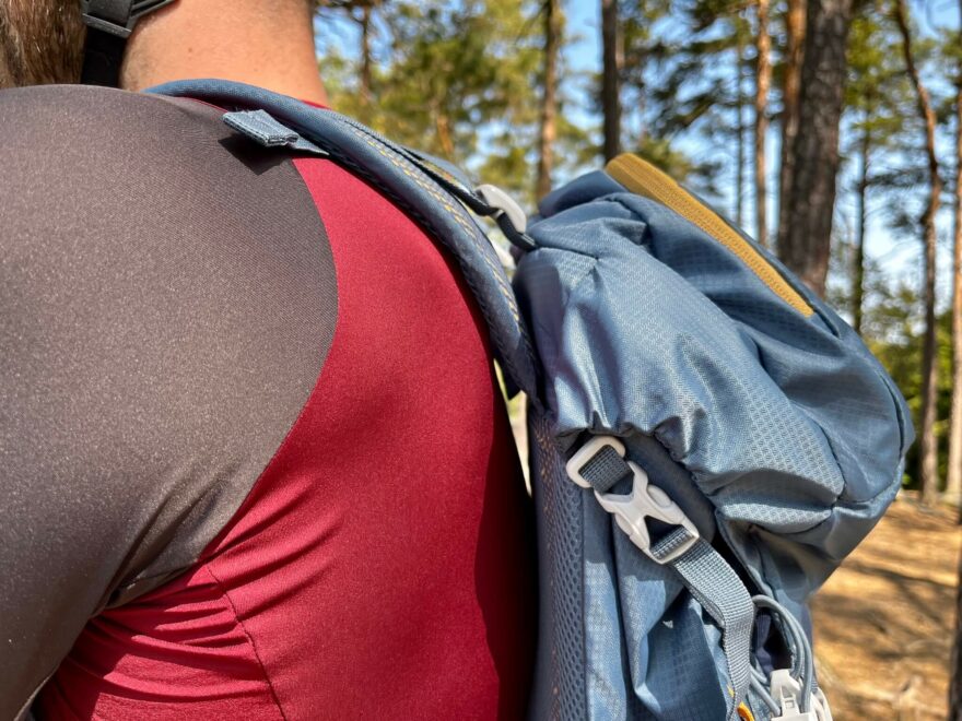 Detail poutek na cepíny nebo hůlky na batohu Ferrino Agile 25.