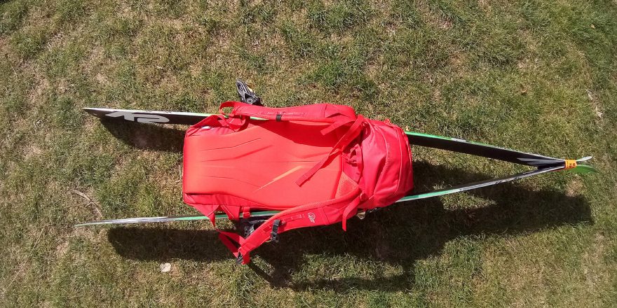 Paralelní fixace lyží na batohu Lowe Alpine Halcyon 35-40 při zasunutí do kompresních popruhů - více od sebe