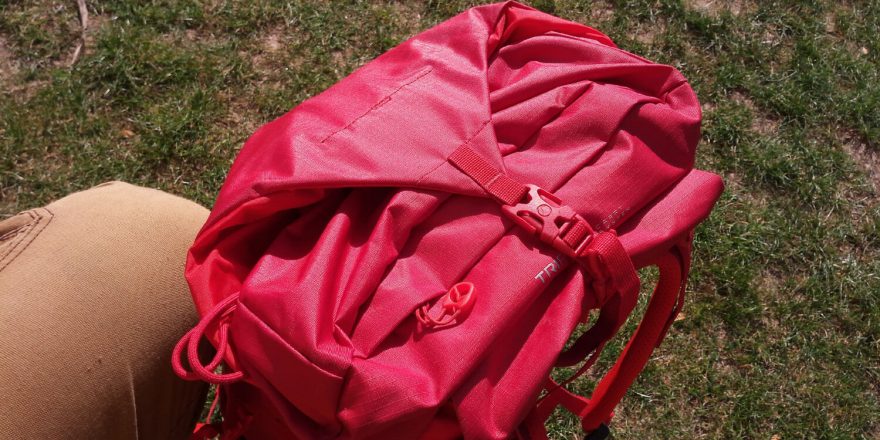 Zajištění víka batohu tak, aby háček hlavního popruhu nevypadnul z oka - Lowe Alpine Halcyon 35-40