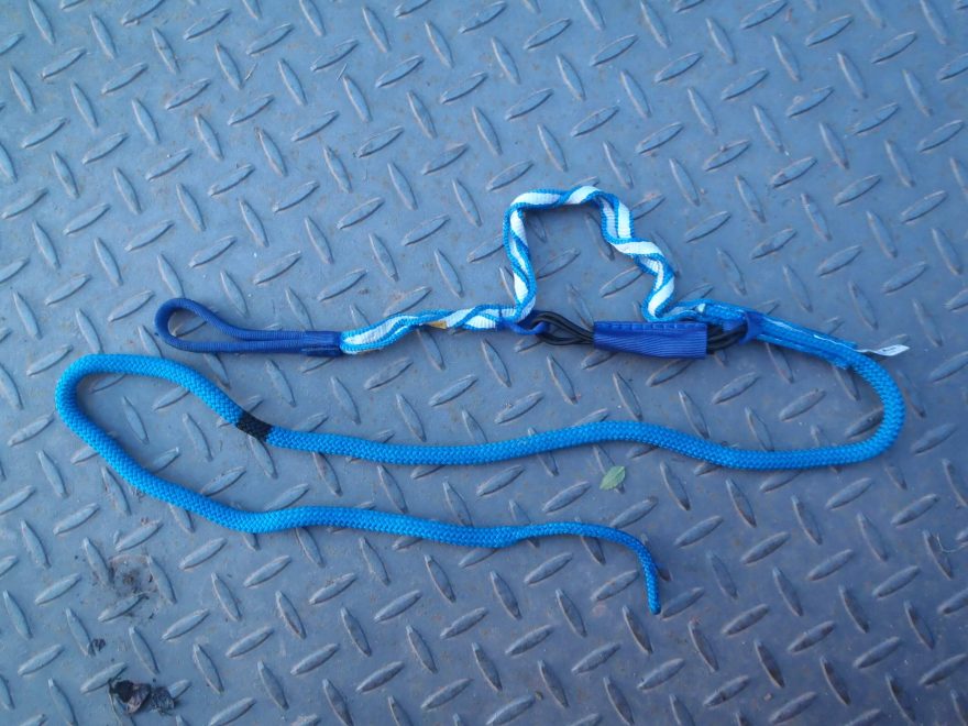 Značka na výtažném laně znamená, že před slaněním nesmí dyneemový popruh být za totou značkou směrem k jeho konci.