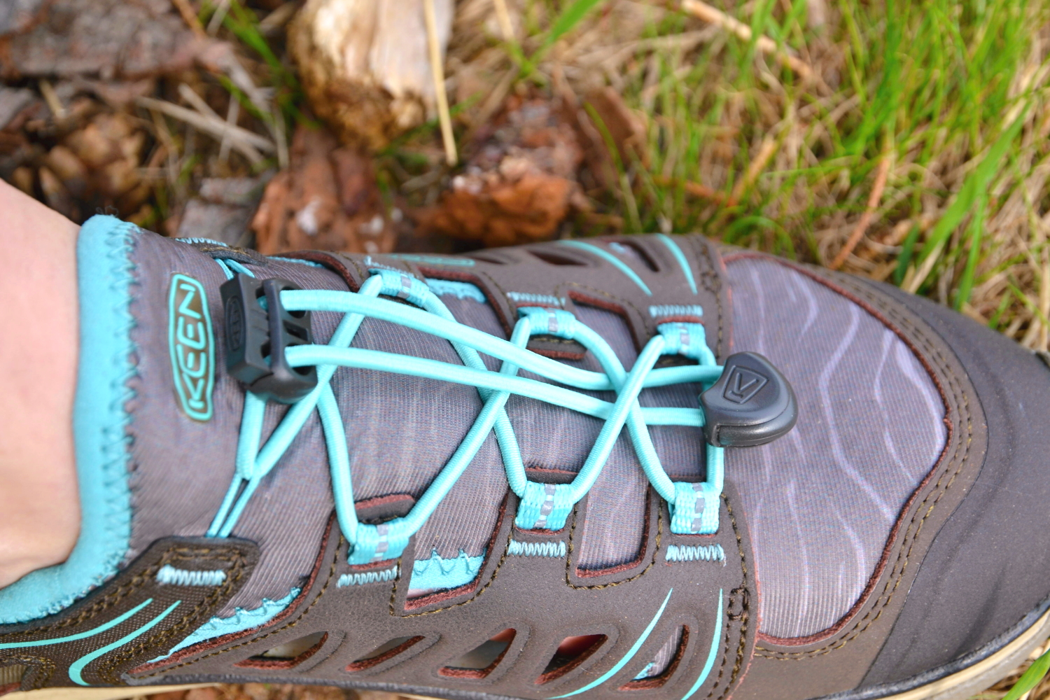 Aby se volná část gumičky nezachytávala o větvičky nebo nepříjemně nebimbala, dá se konec provléknout pod šněrování.
