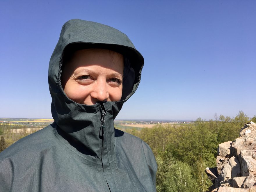 Kapuce bundy Salomon Outspeed 360 3L přetažená přes lezeckou helmu.
