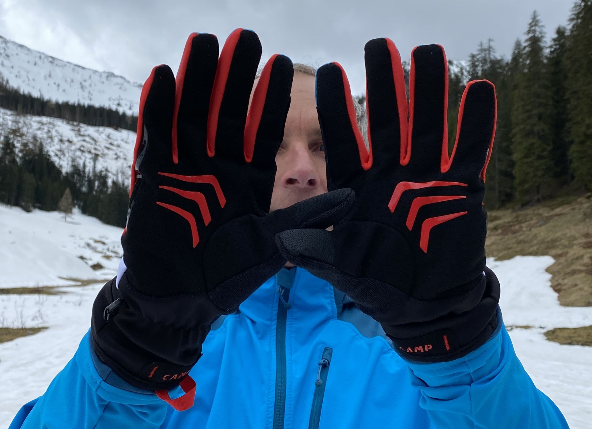 Protiskluzové výztuhy dlaňové části rukavice Camp G COMP EVO a detail palců pro ovládání dotykového displeje