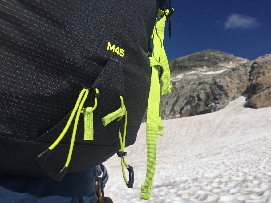 Detail otvoru na zastrčení držáku teleskopickcýh holí a bočního kompresního popruhu - CAMP M45