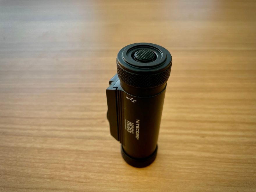 Detail upevnění čelovky Nitecore HC65 na lezeckou přilbu.