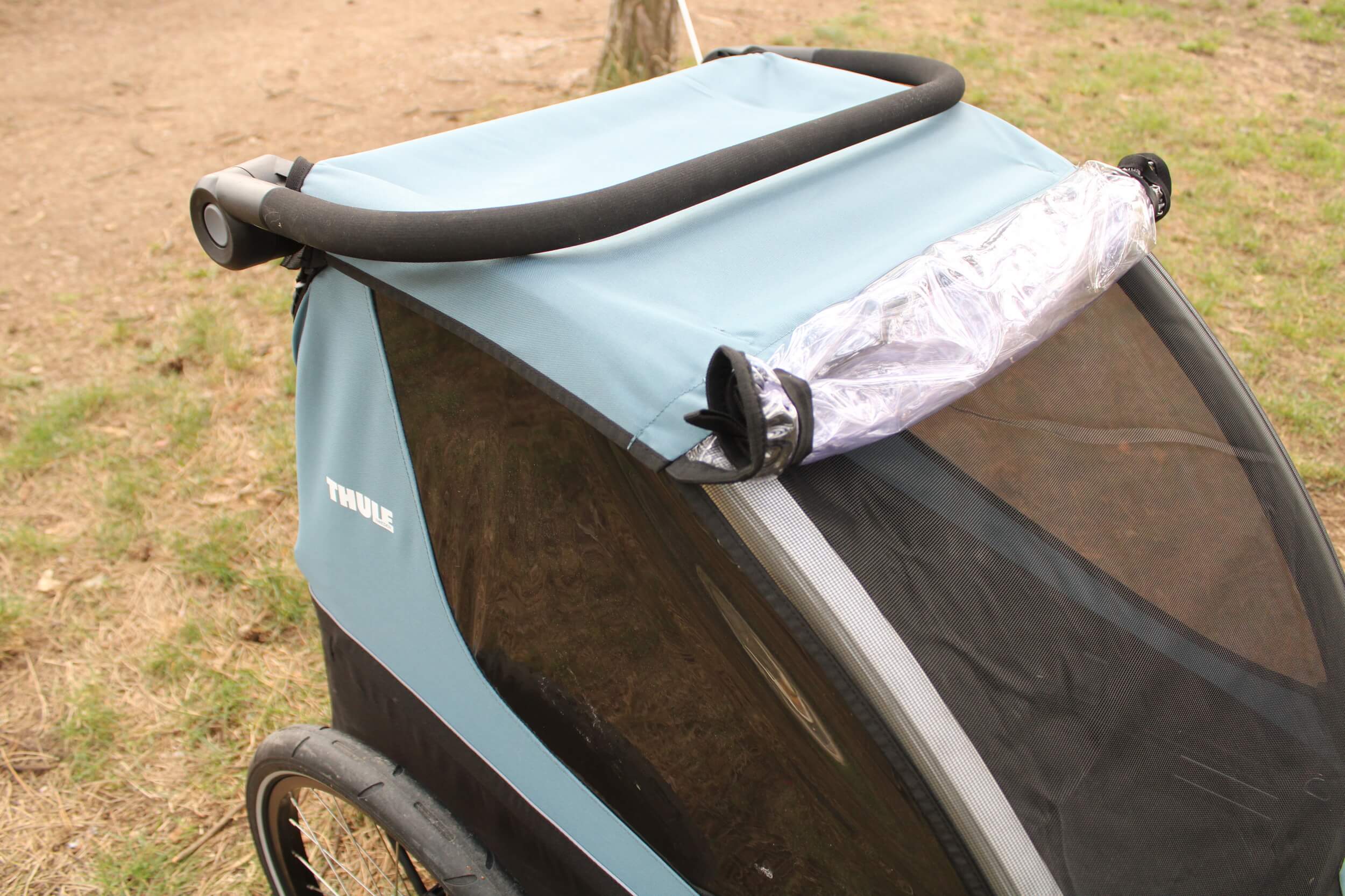 Šikovné detaily cyklovozíku Thule Courier - pohyblivé a polohovatelné madlo a stočená pláštěnka